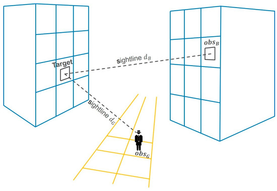 Therefore, we adopted this concept to describe the PVEI in this study. The variable-view distance that contributes to the PVEI can be expressed as 1/d2 for F(d). While the observer is located at an opening that is an element of area in the reality, the sub-function thus can be updated as Aobs/d2. Similarly, the target can be considered as a façade of opening as well. Therefore, it was further updated, and is expressed as Equation (2) for F(d, area).