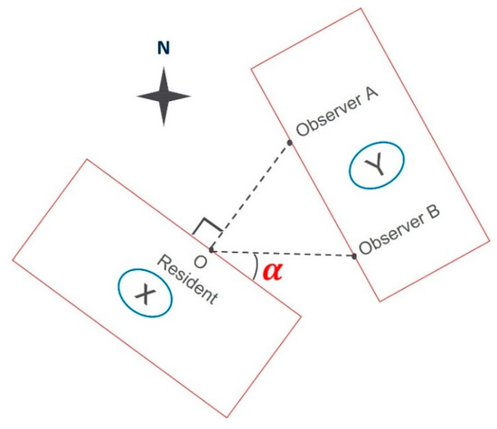 Figure 4 shows the layout of two buildings X and Y viewed from the top. Target O is in building X, and observers A and B are in building Y. Target O and observers A and B are standing at the same level of elevation. Suppose the length of sightline AO is the same as BO: AO is perpendicular to the façade of building X to which resident O belongs, and BO appears to be an acute angle with the façade. It is obvious that the resident is faced with a greater threat of visual incursion from observer A compared to B due to the higher level of visual penetration from location A. In this case, the angle α formed by visible sightline and the resident’s façade travels from 0 to π, the most risk with respect to visual exposure occurs when the sightline travels to AO, and the level of visual exposure gradually decreases on both sides of AO.