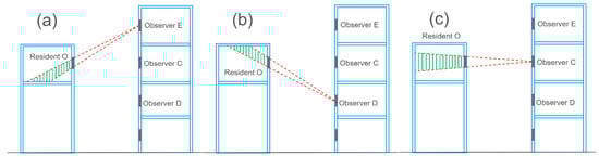 Visual penetration into rooms in different cases: (a) upper floor; (b) lower floor; (c) same floor level.