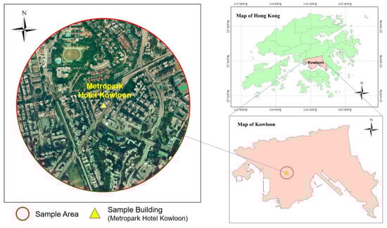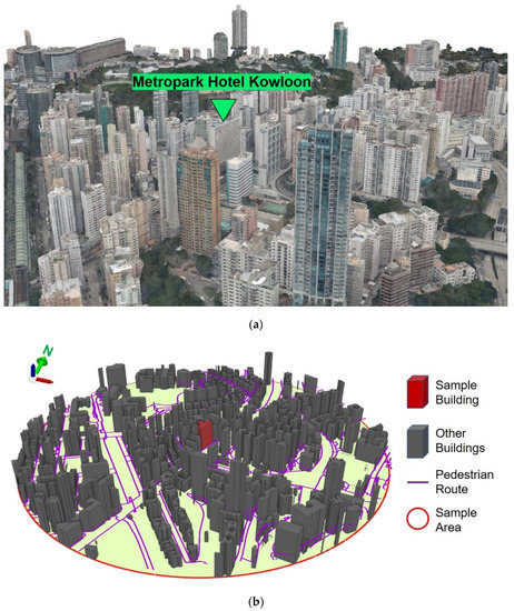Hong Kong is regarded as one of the most densely populated cities in the world. It has more than seven million people inhabiting 1068 km2 of land, and the population density increased from 6352 persons per km2 in 2006 to 6777 in 2016 [43]. As a result, the physical density of Hong Kong, as a universal geographic and spatial concern, has long been a hotspot in research [44]. Kowloon is the peninsula to the northern part of Hong Kong Island, with over 2.2 million people living in an area of less than 47 km2 [43]. Metropark Hotel Kowloon (Figure 7), located at the central heart of Kowloon, with 75.9 m of absolute elevation and 16 typical floors, is represented as a typical building to reflect the local environment, and was thus selected as the sample building in this study.