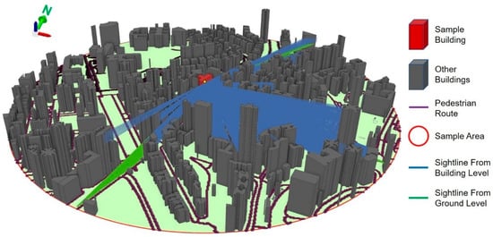 A quantitative assessment of visual privacy was interpreted on the basis of a sample building. The following section details the procedures outlined in Figure 9. The operation was conducted with off-the-shelf functionalities in ArcGIS Pro 2.5, Esri, Redlands, CA, USA.