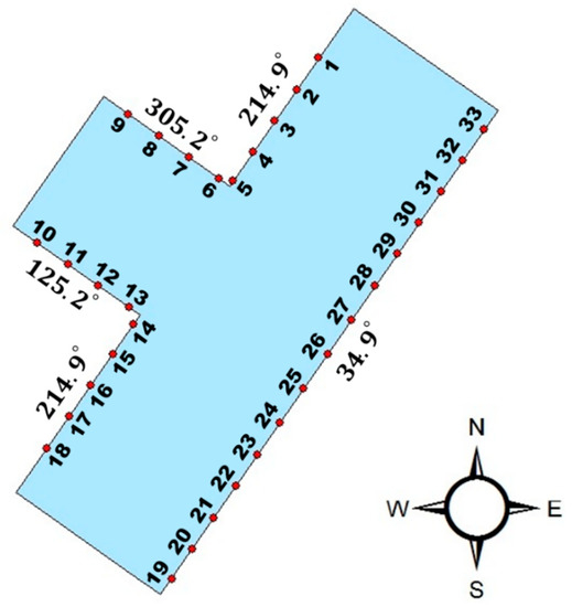 It was noted that the generating azimuth of the sightline was aligned with global coordinates. Since the parameter in the proposed function represents a relative value, it can be calculated with a further computation. Each orientation of the sample building façade is presented in Figure 11; the red dots along the building’s edge indicate the locations of façade openings, and there are a total of 33 openings in columns and 16 openings in the floor dimension aligned in all the building façades. Therefore, the value of α can be calculated and then given to the corresponding visible sightline.