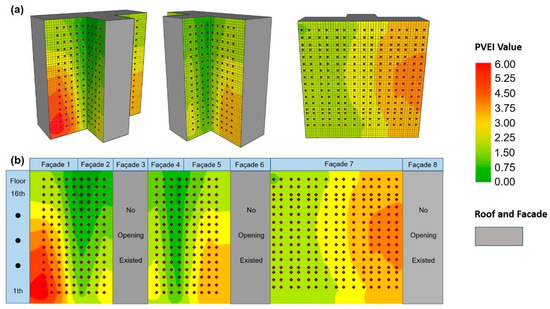 A classification scheme of the visual exposure model applied to the sample building based on the PVEI of each opening: (a) 3D perspective; (b) 2D diagram from the projection of the 3D model.