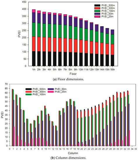 PVEI values according to the floors (a) and the columns (b) under various ranges of the maximum visual distance.