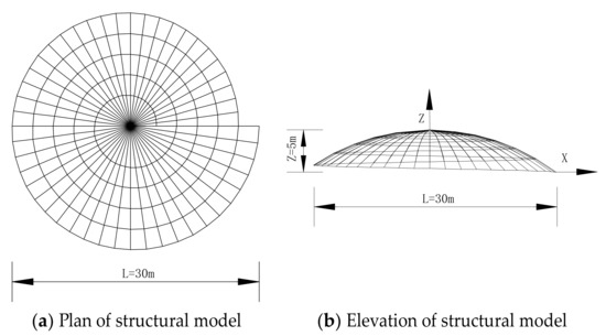 For comparative analysis and research, using the same span (to be exact, the same maximum radius rmax = L/2, ignoring the slight span difference due to the growth feature of the spiral) and height/rise (f or Z)—leading to the same rs, as well as the same ring segmentation and loop number as the above model of the modified structure—we establish a corresponding radial ribbed single-layer reticulated shell model as a comparison model. The plan view and elevation view of the comparison model with rs = 1/6 are shown in Figure 3.