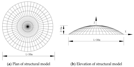 According to their geometric parameters and the principles shown in Section 2.2, the corresponding finite element analysis models are built. Geometric nonlinearity is considered in the analysis. The material nonlinearity is not considered since the reticulated shell in this study buckles in the elastic regime. The steel used for the reticulated shell structure is assumed to be an ideal elastic material (isotropic), of which the elastic modulus E is 201 GPa, the shear modulus is 80.7 GPa, the Poisson’s ratio is 0.3, and the mass density is 7850 kg/m3. The section of the beam element is a hollow round tube of φ219 × 6 mm. It is assumed that the rods of the reticulated shell are fixedly connected, and the nodes at the periphery have three-dimensional hinge supports. These two structures are modeled using Ansys software [15]. The discrete element of the rod is BEAM188. The SURF154 element is used to transfer the uniform load of the structure from the surface to the nodes.