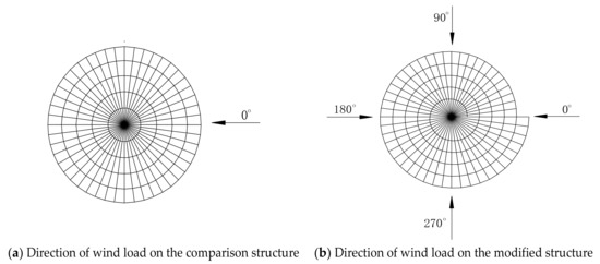 We noticed that the modified structure—the spiral reticulated shell—is an irregular structure, so the effect of different wind direction angles needs to be considered when wind loads are applied. On the contrary, the comparison structure—the ribbed ring reticulated shell—does not need consideration of the wind angle, and the wind direction of 0° is used for all calculations, as shown in Figure 4.