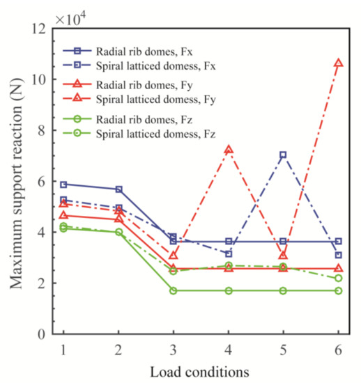 The maximum support reactions of the modified structure and the comparison structure under different load cases are shown in Figure 5. Fx, Fy, and Fz are the reaction force in the X, Y, and Z direction (refer to Figure 2b and Figure 3b for the coordinate system following the right-hand rule). For the modified structure, the overall maximum Fx is happening at Load Case 5 with the wind in the +X direction; the overall maximum Fy is happening at Load Case 6 with the wind in the +Y direction; the overall maximum Fz is happening at Load Case 1 with dead load and live load in control. For the comparison structure, Load Cases 3–6 are the same since the wind is fixed in the −X direction due to symmetry. For the same reason, Fx and Fy are equivalent for design. Fy in Figure 5 is actually the concurrent maximum value. The overall maximums of all reactions are happening at Load Case 1 with dead load in control. Regarding the magnitude of the maximum reactions, Fx or Fy under Load Cases 1–3 has a relatively small difference between the two structures, but Fx or Fy of the modified structure under Load Cases 4–6 has a considerably larger value than that of the comparison structure. Thus, for the modified structure, the design value of Fx or Fy is controlled by the load cases with participating wind loads, while that of the comparison structure is controlled by the dead load and the live load. This shows that the spiral configuration of the modified structure converts a more significant vertical wind suction or wind pressure to the horizontal plane (X/Y direction) and dissipates it to supports, so it has a better resistance to wind suction or wind pressure than the comparison structure.