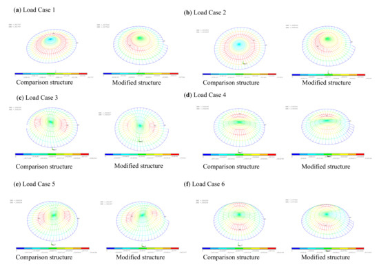 Figure 7 shows that the maximum equivalent stress value of the comparison structure and the modified structure is mainly controlled by the load cases in which wind loads participate. The maximum equivalent stress of the comparison structure has nothing to do with the wind direction angle, and it is always 65.5 MPa under the load combination of Load Cases 3–6. However, the maximum equivalent stress of the modified structure is related to the wind direction angle, which occurs on the windward side, and the range is [48.1 MPa, 66.5 MPa]. In most wind direction angles (Load Cases 3, 4, 6), its equivalent stress is less than that of the comparison structure. At 180 degrees (Load Case 5), its equivalent stress is close to the comparison group. Overall, the equivalent force performance of the modified structure is better than that of the comparison structure. We noted that the maximum equivalent stress of the comparison structure and the modified structure meets the design requirements for the strength of Q235 steel in the Technical specification for space frame structures [14].