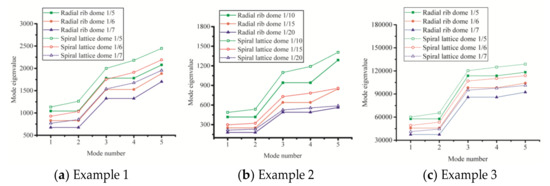 The eigenvalue analysis of the modified structure and the comparison structure without imperfection is shown in Figure 8. The figure shows that the modified structure’s eigenvalue is greater than that of the comparison structure, and the deformation rule is the same (antisymmetric or symmetric).