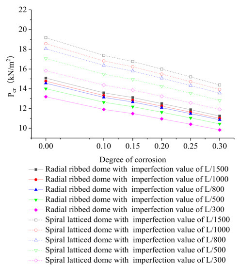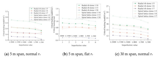 In practice, the structure cannot be ideal because the node imperfections always exist in reality. Therefore, this section shows the calculations and analysis of the critical load of the modified structure and the comparison structure with joint imperfections. The detailed method to introduce node imperfections and find corresponding stable bearing capacity can be found in our previous research [18]. Here, we consider six initial imperfections with different sizes (L/2000, L/1200, L/1000, L/800, L/500, and L/300, where L is span length) to assess the influence of those imperfections on the stable bearing capacity.