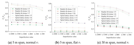In the analysis, the range of the node imperfection amplitude is [L/2000, L/300]. At the same time, the different rs of the structure are considered. The related calculation results are shown in Figure 9. “Flat rs” means a flatter shell with smaller rise-to-span ratio rs, compared with “normal rs”. For structures with node imperfections, in reality, no matter what the value of rs is, the critical load of the modified structure is larger. Hence, its bearing capacity is also greater. The critical load does not always decrease with an increasing imperfection level. When the imperfection is relatively small, the critical load keeps decreasing as the imperfection becomes larger. However, when the imperfection reaches a certain size, the structural configuration changes significantly from the original shape and the structure becomes a new one which might have a higher critical load.