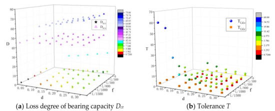 In the above formulas, Pcr,0 is the critical load value when the structural damage degree is 0, Pcr,f is the critical load value when the structural node imperfection is f, and Pcr,d is the critical load value when the structural damage degree is d. Based on these formulas, the tolerance T quantitatively reflects the insensitivity.