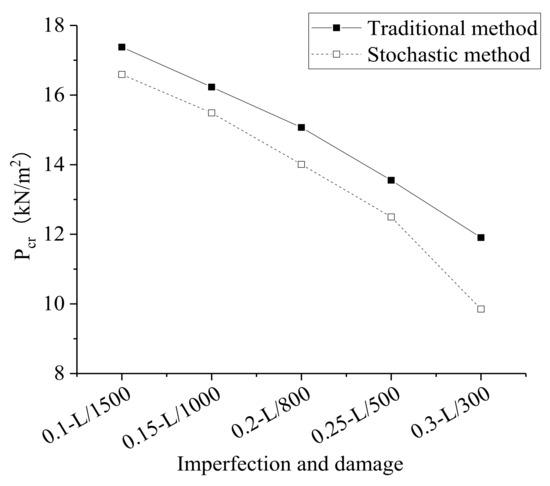 Critical loads detected by traditional and stochastic method regarding the imperfection and damage degree.
