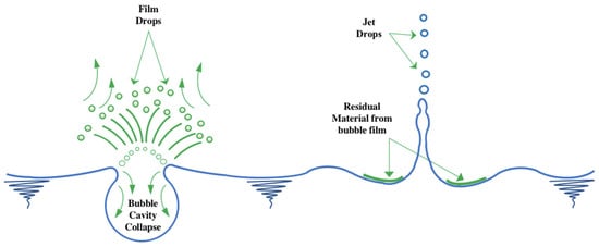 A spa pool involves an air injection system that generates air and water bubbles to produce a relaxing sensation against human skin. Due to the difference in density, bubble films (i.e., air bubbles) originating from water turbulence will rise to the water surface and then burst into film droplets and jet droplets above the water surface (see Figure 1). Jet droplets differed in size in the range of 100 μm, whereas bubbles with diameters of several millimeters could produce film droplets with diameters ranging mostly from 2 μm to 10 μm. These film droplets constitute aerosols that can be inhaled into the lung’s alveolar region [,,].