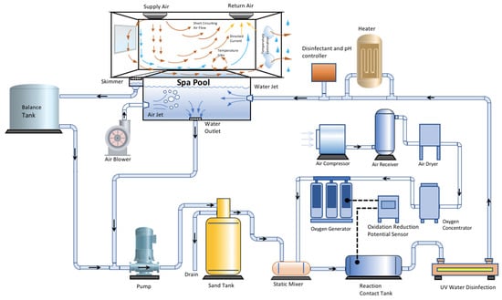 Although some researchers had highlighted the importance of building engineering controls to reduce indoor aerosol transmission in public buildings and public transport facilities [], strategic aerosol control measures for indoor aerosol-generating facilities have received limited attention. In fact, spa pools and similar facilities (such as hot tubs and whirlpools) for recreational, wellness, or therapeutic purposes are not only found on private premises (e.g., club houses) but also are prevalent in venues of the health, tourism, and leisure sector, which is a USD 100 billion market []. Facility users are exposed to high concentrations of the aerosols generated.