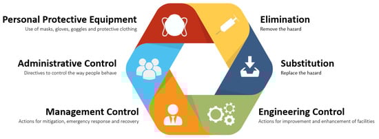 With reference to the hierarchy of controls of the Centers for Disease Control and Prevention (CDC), a multi-pronged strategy comprising six aspects of controls (Figure 3) could be adopted to combat COVID-19 []. Undoubtedly, prevention is better than cure, and elimination and substitution are effective means of control to remove or replace the hazard (i.e., the coronavirus). This reduces the risk of infection and contains the risk of community outbreak, thus alleviating the pressure exerted upon the public healthcare system.