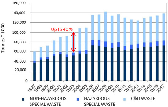 During the year 2017, the production of special waste reached almost 140 million tonnes and the volume of non-dangerous C&D waste was 56 million tonnes [4]. Analysing a larger period, it is much easier to comprehend the behaviour of waste production over time. Between the years 1997 and 2006, the production of special waste underwent a strong increase followed by a more contained growth trend. As shown in Figure 3, because of the economic crisis suffered by the country during the years 2008 and 2009, a reduction happened in special waste production of 5.7%. In 2010, thanks to better economic condition, the increase in production reached 1.8%, and then, following the decrease of construction activity, underwent a deflection again of 4.3%.