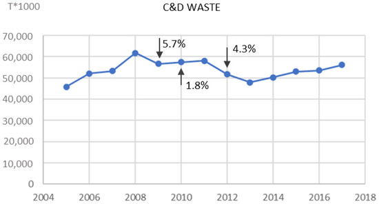 In the country the generated waste is classified as special and municipal waste; regarding C&D waste, it belongs to the special waste group. This category presents two main subgroups, hazardous and non-hazardous waste. The C&D group can be hazardous or not; usually, the high volume belongs to the non-hazardous category, and this means that the chances of being re-used are high. This can be seen in Figure 2 where it is evident that the amount of C&D waste is up to 40%, especially after 2003.