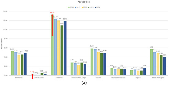 The situation in the centre is similar, with the bigger quantity of waste grouped in the larger regions such as Toscana with a value up to 3.6 million tonnes of waste in 2018, followed by Lazio with 3.5 million in 2018. In the centre, because the number of regions that comprise it is reduced, the results are more homogeneous with two regions with higher rates and the other two with reduced numbers, but in the range of more than 1 million such in March in 2018, as shown in Figure 5b.