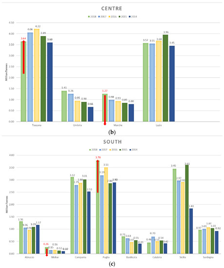 As shown in Figure 5c, the South, similar to the North, comprises eight different regions that generally create distinct scenarios regarding data. The main waste production is generated by Puglia, reaching 3.7 million tonnes in 2018. This data is far from the 13 million generated by Lombardia in 2018 but is the most important data for the southern area. Predictably, the production of waste in this part of the country dominated by agriculture activity is low, with a difference of almost 10 million tonnes in waste amount. The lower data is collected in Molise, which produced only 0.26 million tonnes of C&D waste in 2018, taking into account that this is a small region with low industrial activity.