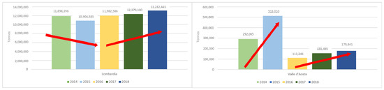 The differences between regions and industrial activities show how the discrepancy of C&D waste production can be significant within the country. To have a clearer perception of how data can change based on the economic status of a region, the territory and the size, some specific cases have been chosen collecting data during a five-year time frame. Confronting the most prolific region, Lombardia, with the less fruitful regions such as Molise and Valle D’Aosta, it can be seen that not all regions present the same behaviour regarding production over time. As shown in Figure 7, the production of Lombardia was linked with economic issues with a decreasing value until 2015 and increasing the quantity of waste with the improvement of the economy after the crisis, with the highest value of 13.2 million tonnes in 2018. The decrease and increase phenomena were not so extended, with only a difference of approximately 1 million tonnes. In the case of Valle D’Aosta, the increase during years 2014 and 2015 presented a difference of 221,005 tonnes with a decrease after 2015 with a difference of the value of 399,764 tonnes. Clearly, the values seem small compared to the 1 million tonne difference found in Lombardia, but the low total rate of waste production as to be considered, because this region is small and so is the production. This result shows how for the small region of Valle D’Aosta the economy was affected in a different way having more repercussions, compared to Lombardia, where, thanks to its status as a bigger region, could survive better to the difference of the market.