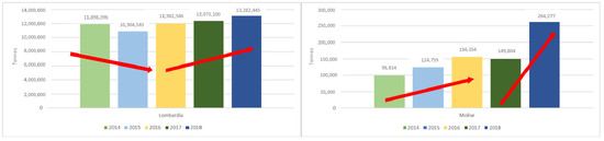 Considering the region Molise in the South compared to Lombardia, another behaviour is presented. This region, similar to Valle D’Aosta, is small and with a limited number of inhabitants and reduced industrial activities. As shown in Figure 8, the adaptation to the economic situation arrived at different timing. In Lombardia the decrease took place between 2014 and 2015, and after that there was only a recovery phenomenon. In Molise, there was a gradual increase in C&D waste production until 2016 with a small decrease of only 6550 tonnes in 2017, followed by another increase of 114,473 tonnes.