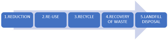 Considering that 40% of the special waste production is C&D [4] and according to the European Union at least 70% of that should be recycled, as shown previously in Figure 6, the country somehow manages to reach that objective, achieving 75% of recycled material in 2017 [4]. The law establishes that the person who must deal with the disposal of construction waste is the waste producer, meaning, the company or the individual who carries out the work. For the correct management of the waste, a priority hierarchy was established, where the less sustainable options presented are the last shown in Figure 9.