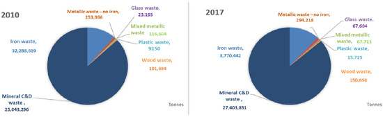 The production of waste material coming from C&D presents different kinds of components. The capacity of recycling such waste depends on the source; it is not the same if the residue is concrete or wood. In Italy, in buildings that were built in the 1960s and after, the prevailing material found during renovation works is concrete [8]. Analysing the situation of the materials obtained after C&D works, the elements achieved are various: metallic, glass, plastic, wood, minerals. In Figure 10 we can deduce how the volume of waste arranged for recycling increased from 2010 up to 2017, but it must be added that during these years the production of waste decreased, reaching 57,421,000 tonnes in 2010 and 56,112,000 tonnes in 2017 [4]. This growth in data regarding reuse is possible thanks to the improvement of the recycling rate up 9.19%.