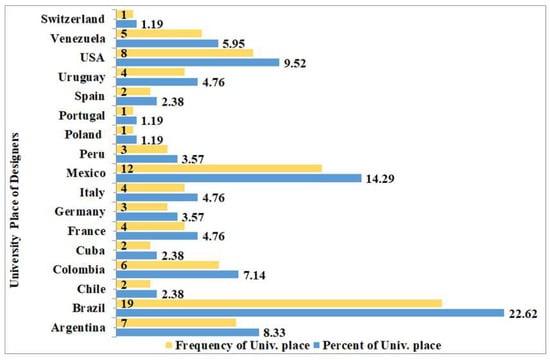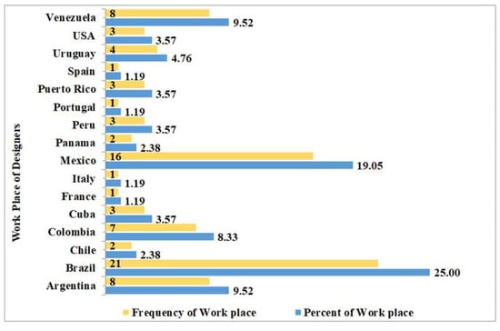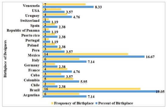 As is shown in the graphic in Figure 1, designers who made their designs in Latin American geography but came to the world from a country outside of this geography were included in the sample. The designers and their architectural products were examined as samples within the scope of the research and within the spirit of the time they were in, generally bearing similar cultural codes with European influence, such as Bauhaus, and North American influence. However, the differences regarding the cultural codes mentioned in the designs of five of the architects born outside this geography could be read more clearly than the works of other designers born outside this geography. Therefore, 5 out of 84 architects were born outside of Latin America, as is seen in Figure 1. These architects were Swiss-born Le Corbusier; two German-born architects, Henry Klumb and Max Cetto; and two Polish-born architects, Leopold Rother and Lucjan Korngold. Ruy Ohtake was born in Brazil as the son of a Japanese artist mother and Japanese engineer father who immigrated to Brazil two years before he was born. Roberto Burle Marx was born in Brazil to a German father and a Brazilian mother. Among these seven architects, Le Corbusier is more recognizable than the others, and the reason behind that is his international and intercultural working style. The opportunity to work in different environments and cultures brings together the possibility of feeding on different cultural pools. Figure 1 shows that Brazil (19.05%), Mexico (16.67%), and Venezuela (8.33%) were among the countries where the examples of architectural designers chosen as samples were born.