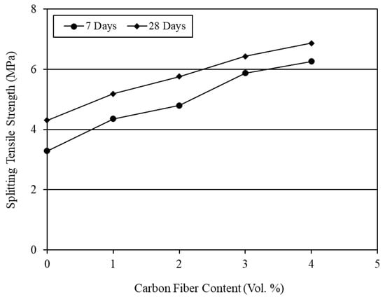 The average results of splitting tension test are given in Table 5. The effect of different carbon fiber contents on the splitting tensile strength of mortar composite is presented in Figure 3. It is obvious from Figure 3 that the splitting tensile strength of CFRM composite increased almost linearly with the increase in carbon fiber content. A similar trend of increase in tensile strength was reported in several past studies [,,,,].