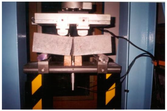 The flexure test was conducted by third-point loading arrangement as shown in Figure 5. The third-point loading test usually gives more reliable results. This is because the probability of a weak element being subjected to the critical stress is considerably greater under two third-point loads []. In third-point loading, the middle-third of the beam is subjected to the maximum bending stress. Therefore, the critical crack may appear at any section within the middle third or it could start in the middle third and then extend to one of the two end-thirds of the beam. In the present study, all specimens failed with a fracture occurring completely within the middle third of the beams; such an example is shown in Figure 5. This indicates that the bottom face of the middle third of the beam experienced the maximum bending stress.