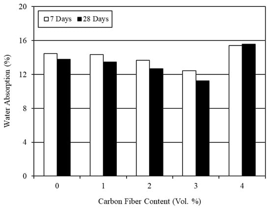 The average test results for water absorption are given in Table 7. The effect of carbon fiber content is shown in Figure 8. It can be seen from Figure 8 that the water absorption decreased with the incorporation of carbon fibers up to 3% fiber content, and then increased at 4% fiber content. Very few studies have been carried out to examine the water absorption of CFRM composite. Ohama et al. [] performed the water absorption test for carbon fiber reinforced cement composite and found that the water absorption tends to decrease with increasing carbon fiber content up to 5%. In the present study, a reduction in the water absorption was observed for the mortar composites including 1–3% carbon fiber contents. In contrast, the water absorption of the CFRM composite with 4% carbon fibers was relatively high, as obvious from Figure 8.