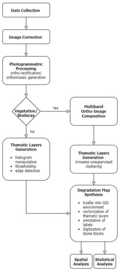 In this research, low-cost and easily implementable methods are presented for stone condition mapping of weathered architectural monuments. Taking into consideration the capacity of the approaches based on imaging, photogrammetry, computational visualizations, and spatial analysis tools to automatize the mapping process described in related work, hybrid workflows combining these techniques are followed. Figure 1 presents the overall methodology design, which branches out into two similar workflows depending on the observed deterioration forms. The two workflows differentiate only during the step of extracting the thematic information using DIP but otherwise follow the same procedure. The methodology starts with the data collection and correction, continues with the multiband data processing generating the necessary background data for the mapping process, leading to the development, and finally, the analysis of thematic degradation maps in free and open source software (FOSS) GIS environment.