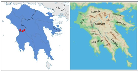 (Left): locations of the case studies, (from east to west) the Temple of Apollo Epikourios at Bassae, the Temple of Athena and Zeus Sotiros at Phigalia, and the archaeological site of Lepreum, in a modern administrative map of Peloponnese (adapted from https://commons.wikimedia.org/wiki/File:Location_map_of_Peloponnese_(Greece).svg (accessed on 1 June 2021), used under a CC BY-SA 3.0 Unported license https://creativecommons.org/licenses/by-sa/3.0/deed.en (accessed on 1 June 2021)). (Right): the Ancient Regions of Peloponnese (https://commons.wikimedia.org/wiki/File:Ancient_Regions_Peloponnese.png (accessed on 1 June 2021), used under a CC BY-SA 2.5 license https://creativecommons.org/licenses/by-sa/2.5/deed.en (accessed on 1 June 2021)).