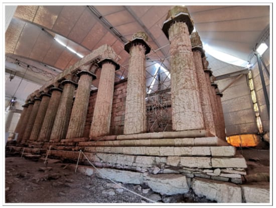 The Temple of Apollo Epikourios (Figure 3) is one of the best-preserved monuments of classical antiquity and an imposing monument of ancient Greek architecture. The temple is positioned at the archaeological site of Bassae and inscribed on the UNESCO World Heritage List since 1986. It was constructed toward the end of the 5th century BC in the rocky heights of the Arcadian mountains, mostly of local limestone. The classical temple was founded on bedrock, on a specially built terrace. It is the only known temple that combines elements of all three architectural orders of antiquity. The temple is Doric, peripteral, distyle in antis, with pronaos, cella, adyton, and opisthodomos. A Doric frieze of undecorated metopes and triglyphs ran along the outer facades. Parts of the temple were excavated and restored in 1902–1906. The Ministry of Culture has overseen the conservation of the monument since 1982. A temporary shelter, erected in 1987, is covering the monument to protect it against the region’s harsh weather conditions and acid rain [54,55].