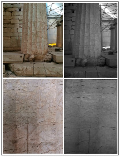 The thematic data about characteristic surfaces at the Temple of Apollo Epikourios were produced by digitally manipulating NIR reflectance images. These images presented more homogeneous radiometry, which was extremely important in order to extract suitable thematic information. In particular, the original and restoration materials that had been previously used presented more similar reflectance characteristics in the near-infrared than in the visible spectrum. Thus, by using NIR reflectance images, the misinterpretation of other degradation forms could be avoided (Figure 4). The architectural surfaces had been mostly cleaned, and therefore, the observable categories of degradation were only loss of material, cracks, and in certain places discoloration. After the NIR images had been corrected and rectified, binary images representing these different categories were produced. Thresholding was applied for identifying discoloration after flat-field correction, which eliminated any remaining inhomogeneous illumination problems. Edge detection and afterward binarization was performed on the first principal component of the images to detect cracks. Finally, histogram equalization and thresholding were performed to identify the loss of material. Figure 5 presents the generation of the binarized category-specific degradation images for an architectural surface and the production of thematic layers in the FOSS GIS environment. The thematic maps produced for investigated characteristic surfaces are presented in Figure 6 and Figure 7.