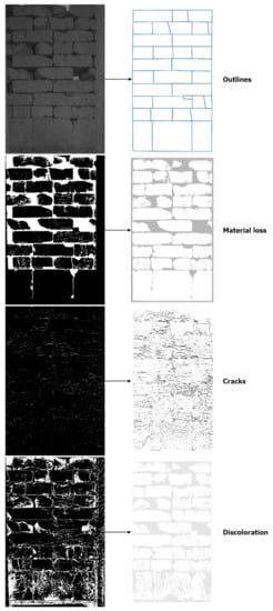 The methodology applied for the thematic degradation mapping depends on the pathology of the studied stone surfaces. For this work, the generation of thematic data was based on digital image processing tools for feature extraction. Different approaches were followed depending on the multiplicity of the observable degradation patterns. Specifically, two distinct procedures were applied. For surfaces characterized only by material loss and discolorations, the feature extraction approaches were mainly based on histogram manipulation, thresholding, and edge detection (producing binarized image outputs). For surfaces characterized by more complex degradation, meaning that also vegetation and biological colonization could be observed, unsupervised image classification was performed with ImageJ2 [50] (producing labeled image results). For all the involved case studies, the ICOMOS Glossary [51] was followed as a guide to identifying the individual degradation patterns during visual inspection of the monuments involved.