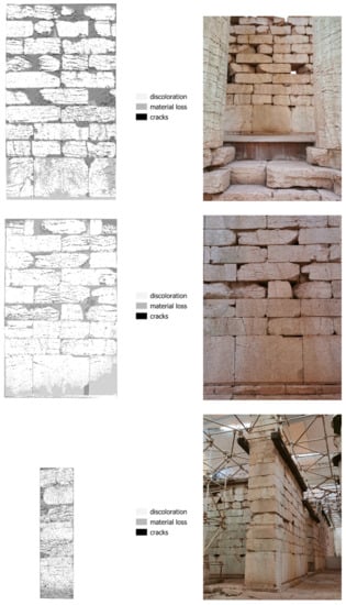 Degradation maps and corresponding images for characteristic areas of walls at the Temple of Apollo Epikourios.