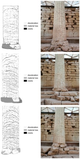 Degradation maps and corresponding images for characteristic areas of columns at the Temple of Apollo Epikourios.