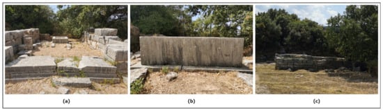 (a) Remains of the ancient Temple of Athena and Zeus Sotiros; (b) the investigated (west) side of the stone cubic pedestal of the worshiping statue; (c) the investigated (north) side of the cella wall.