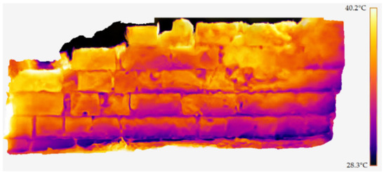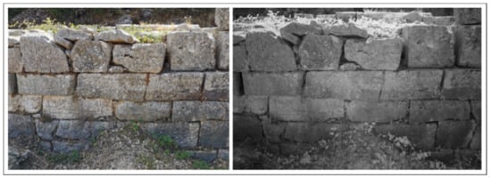 Recorded reflectance intensity data in the near-infrared (NIR) and thermal-infrared (TIR) spectra can improve the automatic classification of the surface patterns, and thus, multiband imaging has been evaluated in this direction [35]. The complementarity of these spectra stems from the dissimilar radiometric signatures that different stone materials, natural weathering forms, and moisture content levels display [36,37]. NIR reflectance imaging proves favorable for detecting vegetation or biodeterioration [38]. Combining true color and TIR imaging increases and mutually enriches their efficiency, particularly when thermograms are presented comprehensively as thermal orthomosaics produced by rectified or orthorectified images. Moreover, infrared thermography has extensively been used as a non-destructive technique for the condition monitoring of historical stone structures [23,37,39,40] that can reveal valuable information about moisture content, material incompatibility, and, in general, the subsurface heterogeneities not observable on optical images. Nevertheless, as a non-destructive technique, reflectance imaging has many defects, such as the cost, resolution, and calibration needs of sensors.