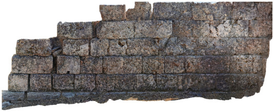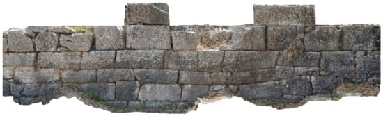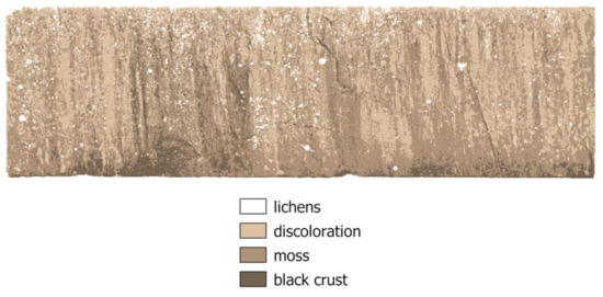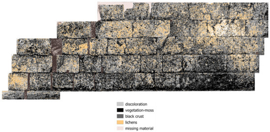 True color images, in particular rectified images and orthomosaics, provide a useful and rich-in-information background for performing manual-digitalization mapping procedures [12,13]. The background quality is important to acquiring quantitative degradation mapping based on visual information [14]. Consequently, the recording of suitable images and the generation of suitable ortho-derivatives is crucial, considering the required spatial analysis and the radiometry that will facilitate the digitalization of all surface patterns [15]. Photo-based and photogrammetry-based mapping allows thematic comparisons [16,17] and contributes to the calculation of damage indexes [10,18]. It helps estimate the cost and analyze the compatibility of interventions [17]. Mapping can be applied for degradation patterns induced by a wide range of weathering phenomena [19,20,21,22,23]. The analysis of the spatial association between different patterns and geomaterials leads to observations regarding the interactions that occur on the historical surfaces [24,25]. The mapping implementation provides significant insight into ongoing weathering processes, especially after supplemented with information from analytical techniques and environmental measurements [26,27,28,29,30]. Manual photo-based mapping is a technique widely used in architectural conservation.
