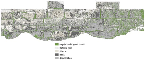 Detailed thematic maps, which presented the architectural surfaces’ degradation for characteristic parts of the investigated case studies, were developed in QGIS 3.18.2 [52]. The rectified images and orthoimage mosaics were utilized as the GIS base maps to annotate the geometric shape of building stone elements. In addition, an individual block approach was considered as it would allow for the description and analysis of degradation at a structural element level [53]. The spatial data input regarding degradation patterns was performed by automatically vectorizing the digital image processing raster results into different layers. The topology of the thematic data was essential for establishing digital connections between spatial entities to implement spatial analyses successfully [15,17]. Therefore, after the polygonization of different degradation forms, the generated spatial entities were thoroughly checked and corrected. At the end of the digital map development process, the structural elements’ outlines and each degradation typology were represented by a different thematic layer.