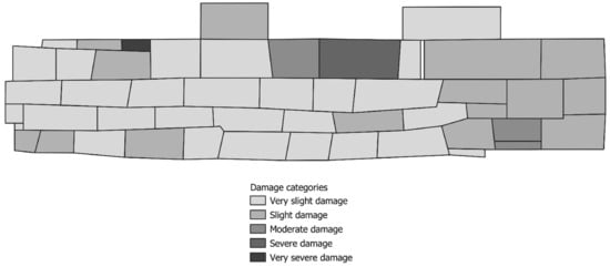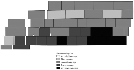The constructed thematic maps were used to visualize the architectural surfaces’ pathology and further exploited to extract numerical information and present the overall condition of building stone elements. Spatial and logical analysis based on the thematic layers was used to extract statistical information and damage indexes. The first step for determining the indexes was calculating the spatial join of all biological colonization-related crusts, vegetation, and material loss thematic layers. Then, depending on the percentage of each stone block’s coverage by this joined layer, the stones were categorized according to damage severity in five categories.