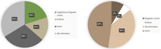 Degradation pattern statistics for the investigated surfaces at the remains of the Temple of Athena and Zeus Sotiros; cella wall (left) and cubic stone pedestal (right).