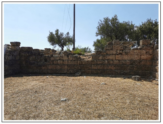 The Temple of Athena and Zeus Sotiros is the most notable excavated monument of the ancient city of Phigalia. It is located on the hill “Kourdoumbouli” at the southwest end of the Agora of the ancient city. It is a rectangular temple with pronaos and cella. The life of the temple spans from the 4th century BC until the Roman Era, while there must also have been an Archaic phase. It was constructed of large stone blocks according to the irregular isodomic system and is preserved up to a height of three building blocks (Figure 8). The stone cubic pedestal of the worshiping statue was found in the cella, while there was a table for offerings in front of it. The large number of inscriptions found inside the temple testifies to its political significance for the city of Phigalia [56].