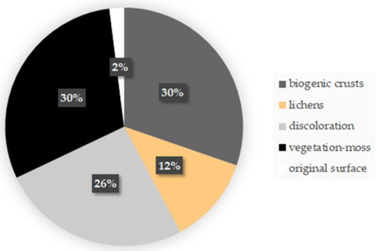 For this case study, photogrammetric approaches were followed using multiband datasets (examples of reflectance images shown in Figure 17), as described in Section 3.2, to generate the necessary base maps for the mapping process. The thermal orthoimage mosaic was produced following a hybrid approach exploiting both the visible and thermal images captured by the FLIR One Pro camera [58] (Figure 18). The false-color multiband image mosaic composed of three single-band mosaics (RGB, NIR, and TIR) was classified to create the thematic map (true-color image shown in Figure 19 and final degradation pam in Figure 20). Statistics were again calculated for the coverage of the historic surface by various degradation forms (Figure 21), while the damage map (Figure 22) considered the presence of vegetation, moss, and biocolonization. Additionally, in this case study, the historical surface was almost entirely covered by biogenic material or discolored.