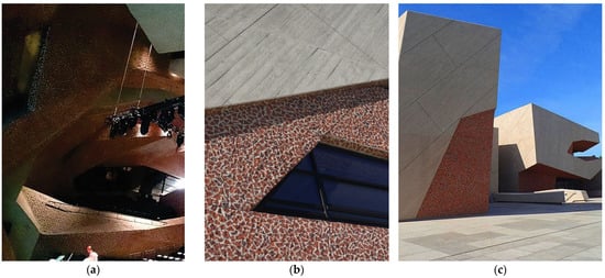 CKK Jordanki Congress and Culture Centre, Toruń, 2015, arch. Menis Arquitectos. (a) Interior cladding with concrete-brick conglomerate panels. Source: https://pl.m.wikipedia.org/wiki/Plik:Auditorium_of_Conference_and_Cultural_Centre_%22Jordanki%22,_Toru%C5%84,_Poland.jpg (accessed on 31 May 2021), photo by M. Sulik. (b) Exterior wall cladding with picado technique, (photo by M. Celadyn). (c) Exterior view. Source: https://commons.wikimedia.org/wiki/File:Centrum_Kulturalno-Kongresowe_Jordanki_w_Toruniu92.jpg,photo (accessed on 31 May 2021) by Mateuszgdynia.