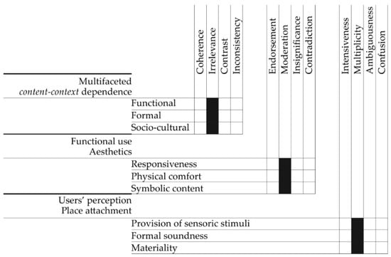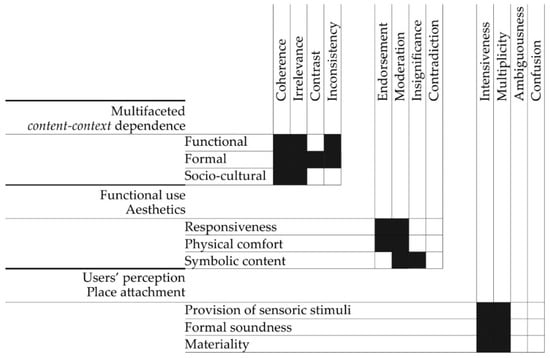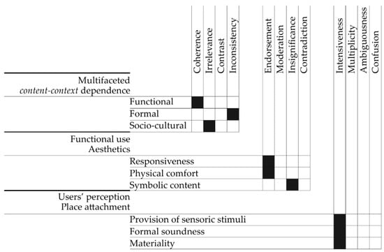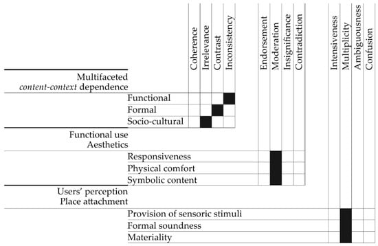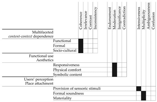 - Coherence, understood as endorsement of the level of building functional use, as well as an exposure of formal uniformity, to influence the multisensorial experience of the built environment and thus intensify the sense of topophilia [];